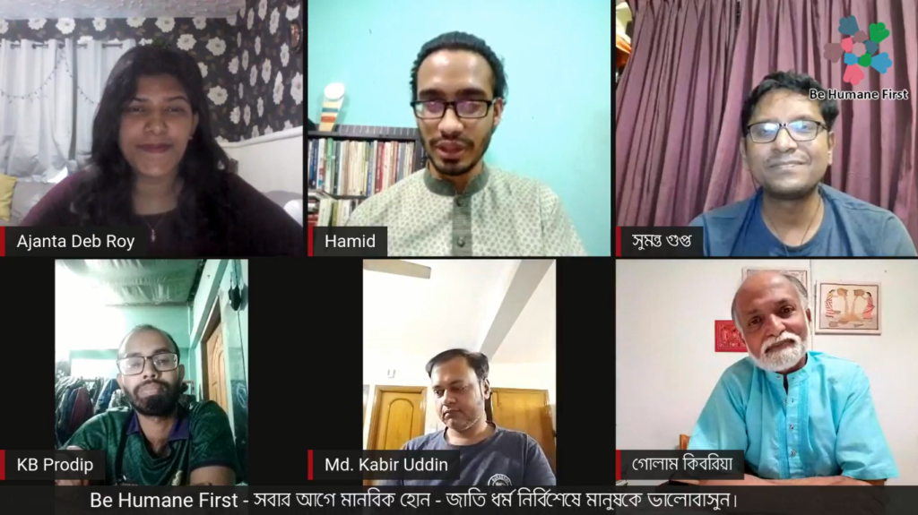 মোঃ হামিদ উদ্দীনের সঞ্চালনায় এতে উপস্থিত ছিলেন আবৃত্তি শিল্পী সুমন্ত গুপ্ত, আমেরীকা প্রবাসী গোলাম কিবরীয়া, চট্টগ্রামের ভলান্টিয়ার কো-অর্ডিনেটর মিলন দত্ত, কবি সোমা মূৎসুদ্দী, সিলেট থেকে প্রজেক্ট কো-অর্ডিনেটর কেবি প্রদীপ দাস, চিকিৎসক মোঃ কবির উদ্দীন এবং হিউম্যান ফার্স্ট মুভমেন্টের প্রতিষ্ঠাতা এবং পরিচালক অজন্তা দেব রয়।